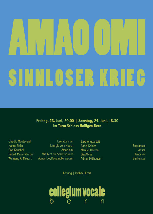 Es freut uns sehr, Sie zu unserem Konzert unter dem Motto „Sinnloser Krieg“ im Schloss Holligen begrüssen zu dürfen. Die Musikstücke, die Sie zu hören bekommen, werden hierzulande selten aufgeführt, und die Begleitung durch vier Saxophonisten ist eine musikalische Überraschung.
