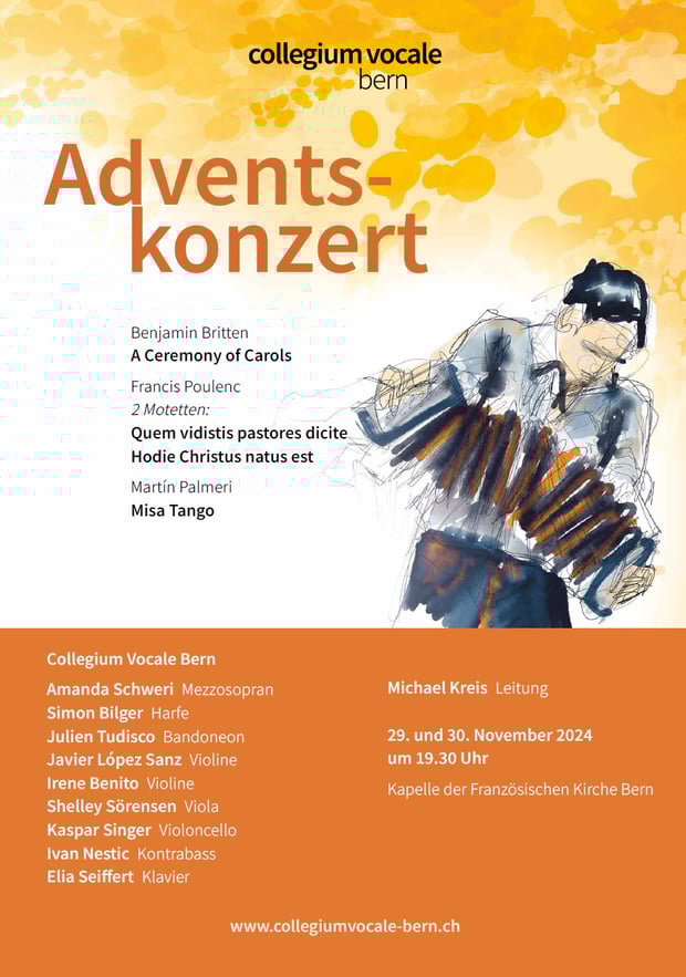 Die «Misa Tango», das Herzstück unseres Konzerts, ist eine Messevertonung des argentinischen Komponisten Martín Palmeri (*1965). Sie wurde 1996 in Buenos Aires uraufgeführt. Palmeri ergänzt die klassischen Bestandteile einer Messe, gesungen in lateinischer Sprache, mit den harmonischen und rhythmischen Merkmalen des Tango Nuevo. So werden Stilelemente verschiedener Kulturen in der Misa Tango verbunden. Mit Bandoneon, Klavier und Streichern, der klassischen Tango-Formation, erleben Sie unmittelbar die mitreissende Tango-Stimmung. Lassen Sie sich von dieser besonderen Musik berühren.
