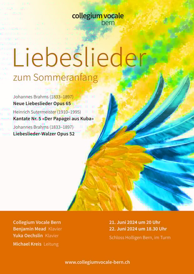 Das Collegium Vocale Bern, unterstützt von den Pianisten Benjamin Mead und Yuka Oechslin, breitet den Klangteppich der Liebeslieder zum Sommeranfang für die Zuhörenden aus. Nach dem Brahmszyklus Neue Liebeslieder Opus 65 steht ein total gegensätzliches Werk auf dem Programm: Die Kantate Nr. 5 «Der Papagei aus Kuba» des Schweizer Komponisten Heinrich Sutermeister, eine Auftragskomposition des Schweizer Radio SRG aus dem Jahr 1962.
